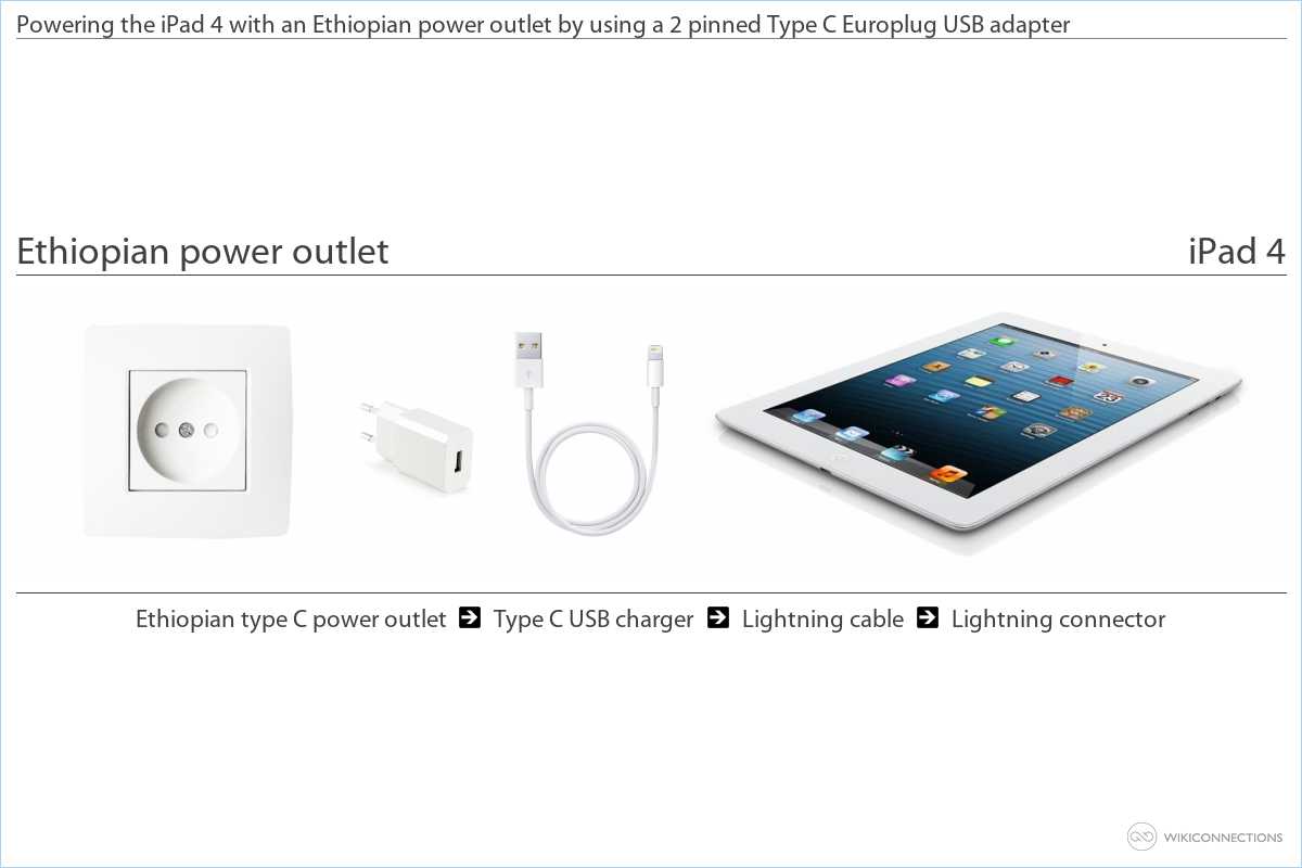 - In order to power your iPad 4 using an Ethiopian power outlet you will need a Type C USB power plug adapter [4] and a USB to Apple Lightning cable [5] (Apple normally include this cable when you first purchase your iPad 4).