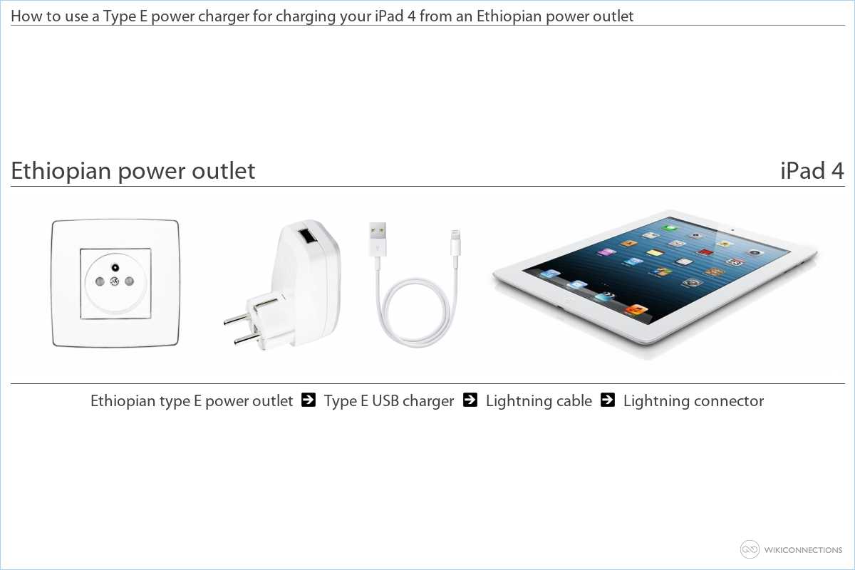- To supply power to the iPad 4 using the Ethiopian power outlet you'll need to use a Type E USB power plug adapter [7] and a USB to Apple Lightning cable [5] - Apple typically supply this cable when you first purchase your iPad 4.