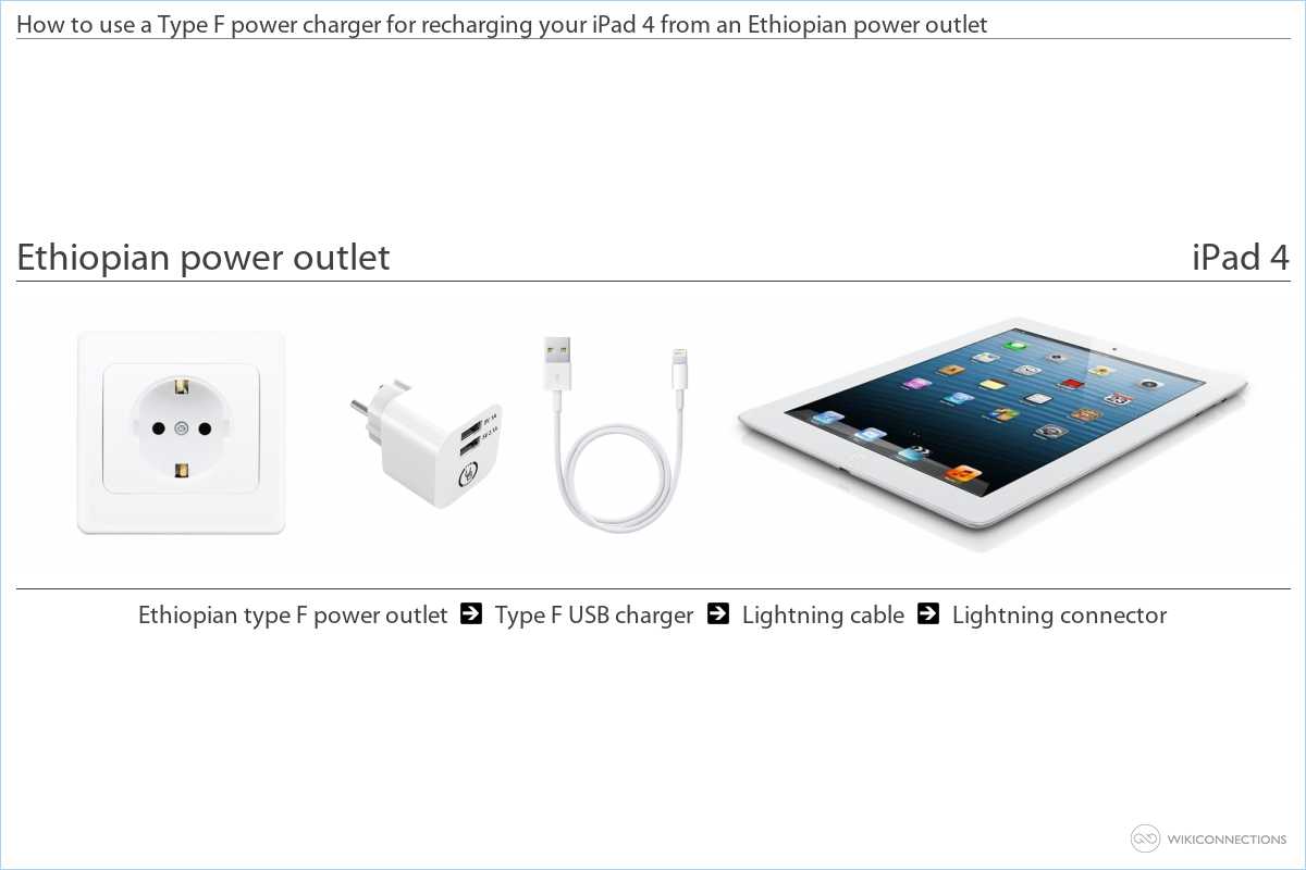 - To supply power to your iPad 4 from the Ethiopian power outlet you'll need to use a Type F USB power plug adapter [9] and a USB to Apple Lightning cable [5], Apple will usually supply this cable with your iPad 4.