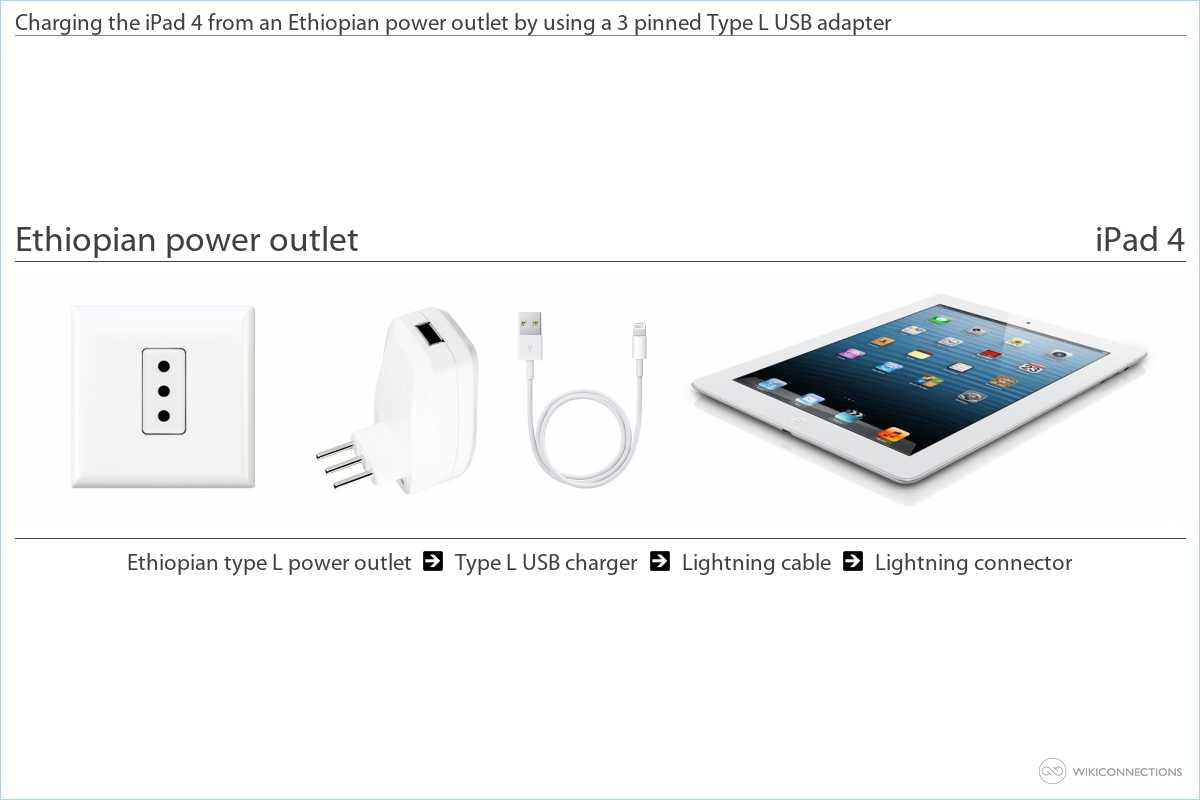 - If you want to supply power to the iPad 4 using an Ethiopian power outlet you will need to buy a Type L USB power plug adapter [11] and a USB to Apple Lightning cable [5] - Apple normally include the cable when you first purchase the iPad 4.