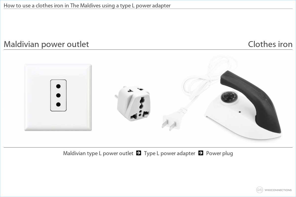 - You will need to use a Type L power adapter [12] if the type of plug used on your clothes iron isn't the same shape as the power outlet which is used in The Maldives. The plug adapter will help adapt plugs from other countries for use in a power outlet used in The Maldives by changing the shape of the plug, however the adapter doesn't change the frequency or voltage of your clothes iron to work with a 230 volt outlet.