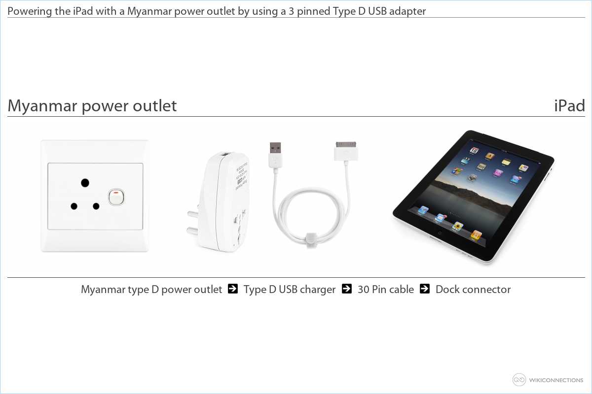 - In order to charge your iPad using a Myanmar power outlet you will need to buy a Type D USB power plug adapter [9] and a USB to Apple 30 pin cable [5] - the cable is usually already included with your device by Apple.