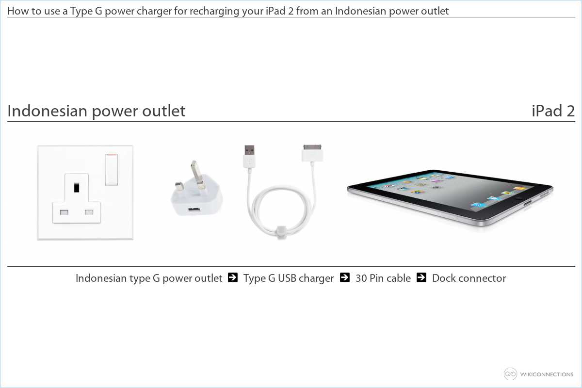 - In order to charge the iPad 2 using the Indonesian power outlet you'll need to buy a Type G USB power plug adapter [4] and a USB to Apple 30 pin cable [5] (the cable is typically included with the iPad 2).
