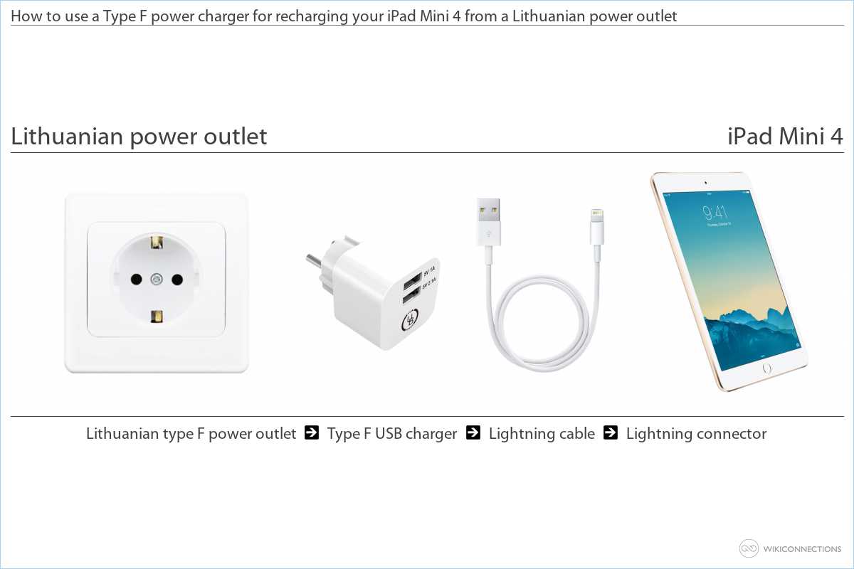 - If you want to charge the iPad Mini 4 from the Lithuanian power outlet you will need to use a Type F USB power plug adapter [7] and a USB to Apple Lightning cable [5] - usually included with the device.