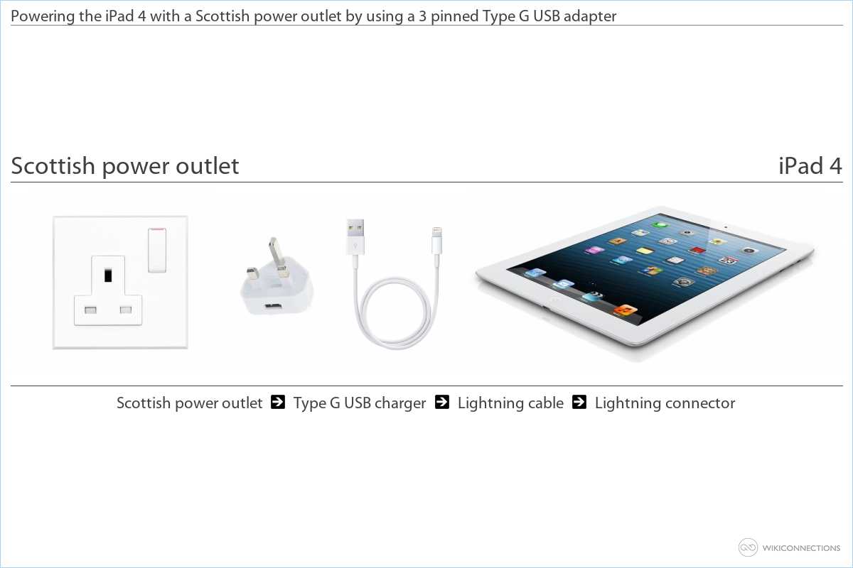 - In order to charge the iPad 4 from the Scottish power outlet you'll need to use a Type G USB power plug adapter [4] and a USB to Apple Lightning cable [5] (this cable is usually already supplied with the iPad 4 by Apple).