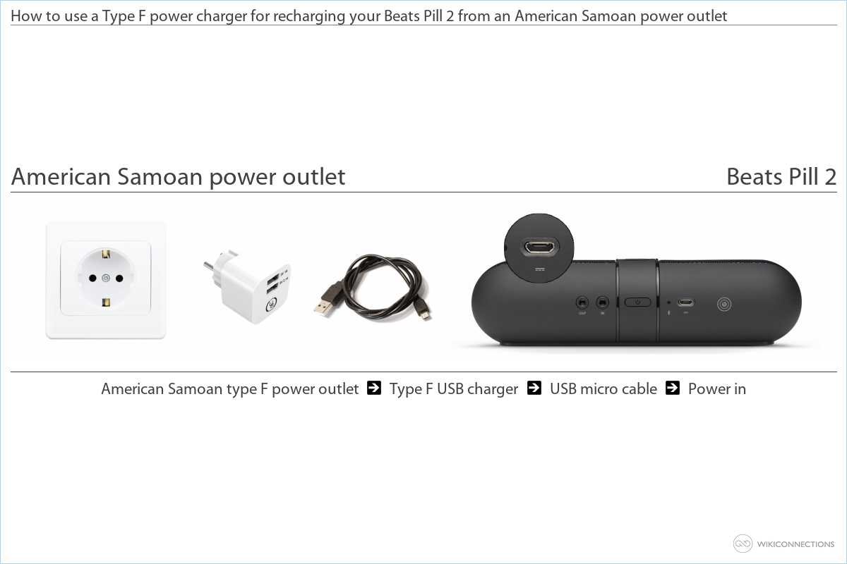 - If you want to charge your Beats Pill 2 using the American Samoan power outlet you'll need to buy a Type F USB power plug adapter [10] and a USB 2.0 A Male to Micro B cable [6].